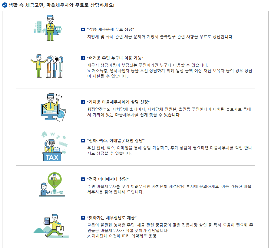 마을세무사 이용을 희망하는 분께서는 아래 행정안전부 사이트를 참고하시어 거주지역의 마을세무사를 검색, 연락하셔서 도움을 받기를 바랍니다.