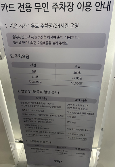 동대문 공영주차장(DDP 패션몰) 주차장을 이용한 고객은 출차 전에 동대문 디자인플라자(DDP)를 이용한 영수증 지참 후, 지하 2층(B2) 정산소에서 할인 정산을 받아야 한다고 합니다.