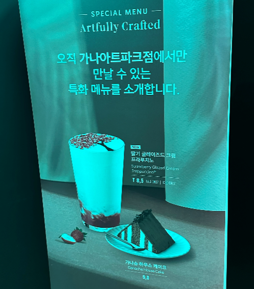 스타벅스 가나아트파크점에서만 만나볼 수 있는 특별한 음료와 푸드가 있었습니다. 바로 딸기 글레이즈드 크림 프라푸치노와 가나슈 케이크였는데요,