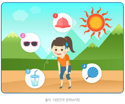 흔히 '더위를 먹는다'라고 말하는 '열사병, 일사병'을 피하는 방법은 간단합니다. 낮 최고 기온이 33도 이상을 웃도는 날에는 되도록 외출을 삼가시고 지속적인 수분 섭취해야 합니다. 불가피하게 외출을 하실 때에는 모자를 쓰시고, 물을 꼭 소지하시고, 부채나 소형 선풍기를 활용하시기 바랍니다. 올해는 비가 많이 오고 무더위가 심하다고 하니 모두 유의하셔서 나의 몸과 가족의 몸을 지키시기 바랍니다.