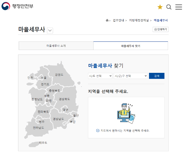 마을세무사 이용을 희망하는 분께서는 아래 행정안전부 사이트를 참고하시어 거주지역의 마을세무사를 검색, 연락하셔서 도움을 받기를 바랍니다.