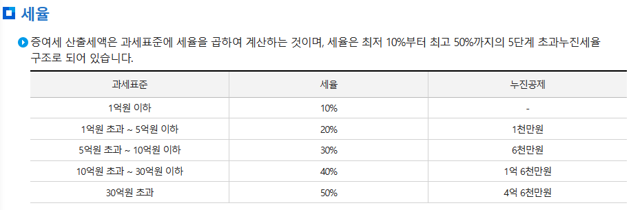 위 공제금액을 초과하여 증여하게 될 때는 증여세를 내야 하는데요, 세율을 알아보겠습니다. 세율은 과세표준에 따라 다르게 적용되며, 최저 10%부터 최대 50%까지 5단계 초과누진세율 구조로 되어 있습니다.