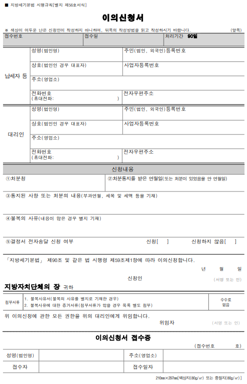 납세자는 처분이 있은 것을 안 날부터 90일 내에 관할 구/시청 민원실에 이의신청서 2부를 접수하여야 합니다.