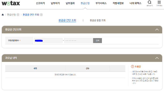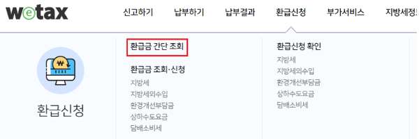 - 위택스 메인에서 '환급신청 - 환급금 간단 조회' 선택