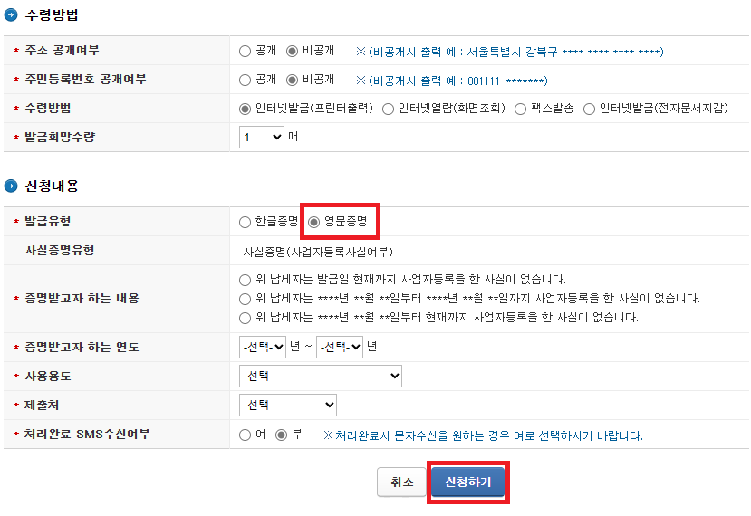☞ 발급 유형: 영문증명