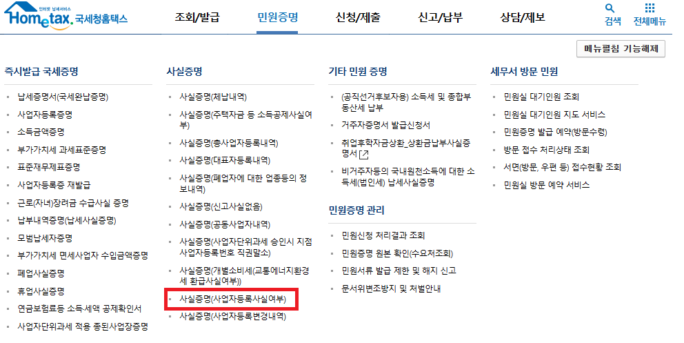 메인 페이지 상단 카테고리에서 '민원증명 - 사실증명 - 사실증명(사업자등록사실여부)'을 클릭합니다.